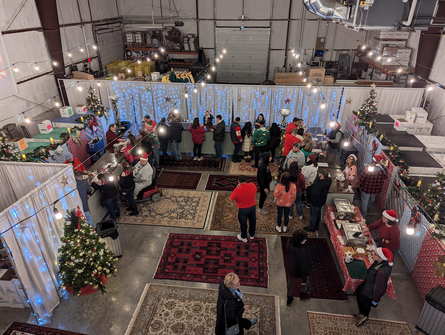 We decorate our warehouse for the Deck-the-Halls weekends. It is a team effort all the way around.